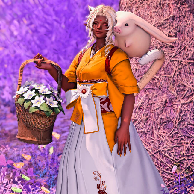Haykrii (Hai-kree) was raised in Kugane to a settled-down adventurer mother & self-made merchant father, with an odd occurrence - she was born with both Miqo'te and Elezen ears! With her father doting on her, she grew to be spoiled & studious, but she was restless for adventure.When she met her now husband, Tommy, a well-traveled samurai, he lit a fire under her to follow her dreams. They left for Eorzea and eloped without telling her family until she was already across the salt.She became a paladin for the Ishgardian Orthodox Church, fought in the Dragonsong War (and all the other potentially world-ending events since...) and is now a jack-of-all-trades freelancer, living in Shirogane & running her teahouse. She makes it a point to visit her parents in the city often.She hopes to settle in her mother's homeland of Radz-at-Han if they ever build adventurer housing.